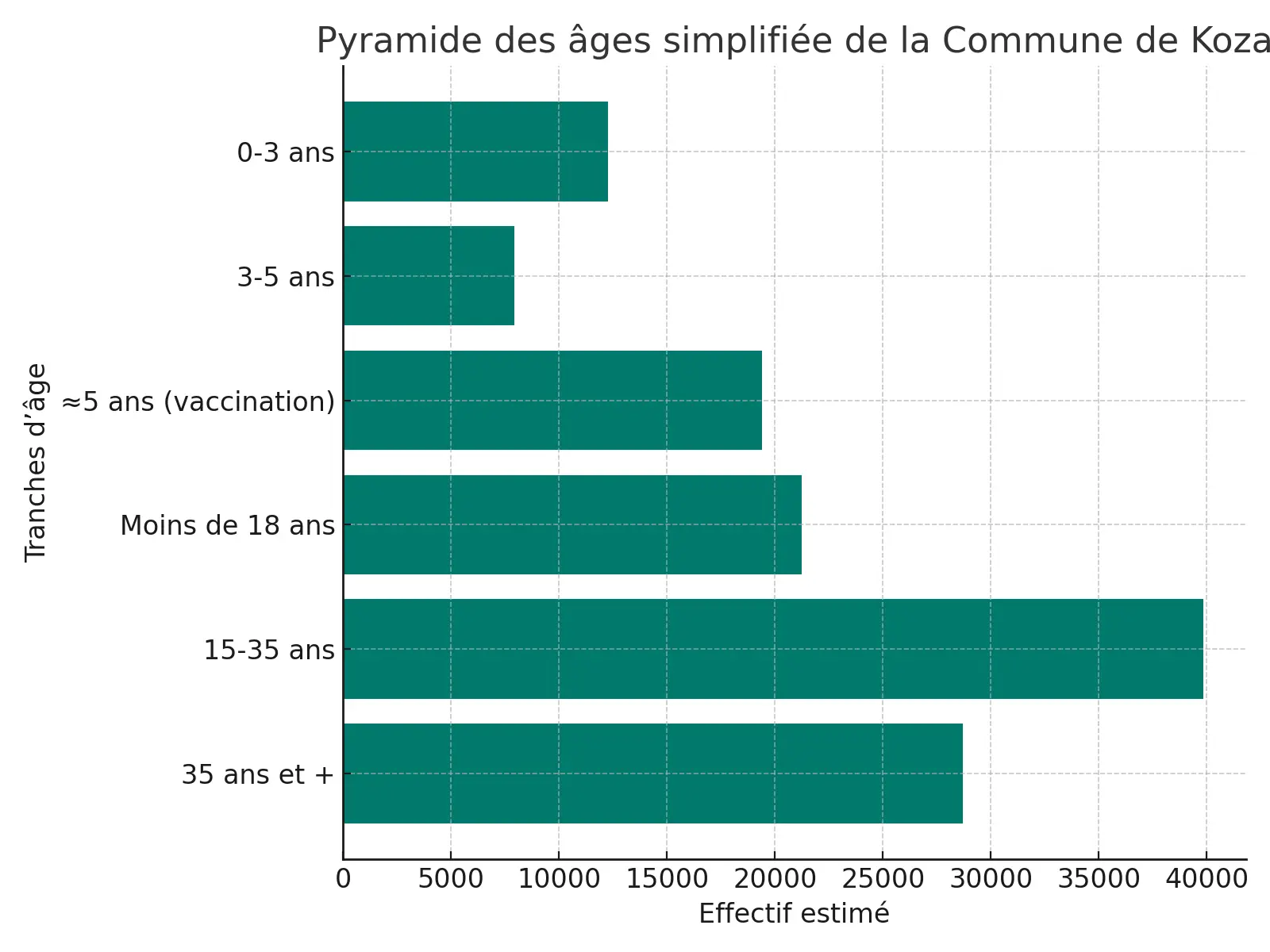 Il ressort ensuite que la Commune de KOZA compte les enfants et adolescents de moins de 18 ans estimés à près de 21 239. D’où la nécessité pour la Commune de mettre en place des stratégies d’accompagnement de ces jeunes en investissant dans les domaines de la santé, de l’éducation, de l’enseignement professionnel, de l’épanouissement psychosocial des jeunes.